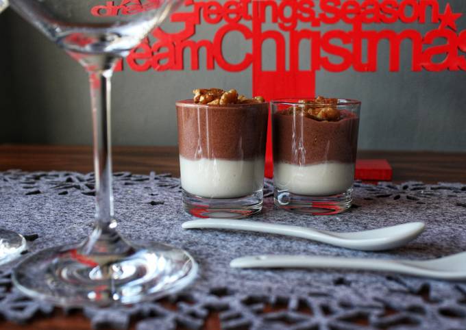 - Zum Abschluss die Sahne steif schlagen und mit dem Schokoladenpudding und den Nüssen abwechselnd in einem Glas schichten..