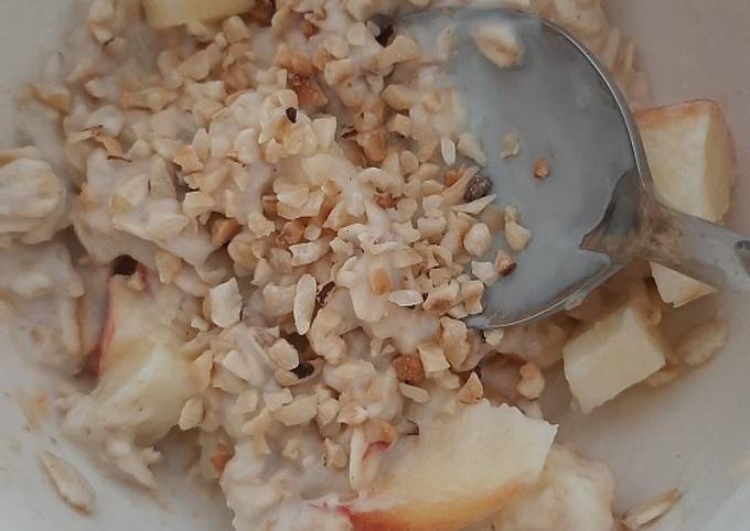 - Ab und zu umrühren, damit Apfel nicht braun wird. Haselnüsse oder Mandeln über das Müsli streuen und genießen..