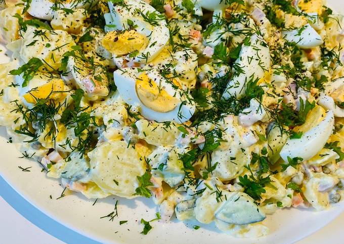 - Mayonnaise, Joghurt, Senf und Kräuteressig verrühren. Alle vorbereiteten Zutaten in eine Schüssel geben, mit dem Dressing vermischen. Kräuter waschen, hacken und unter den Salat heben. Mit Pfeffer würzen und mit etwas Dill garnieren..
