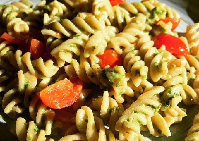 - Die gegarten Nudeln abgießen und in eine Pfanne geben. Soße und Cocktailtomaten drüber verteilen und alles nochmal vermischen und kurz erhitzen..